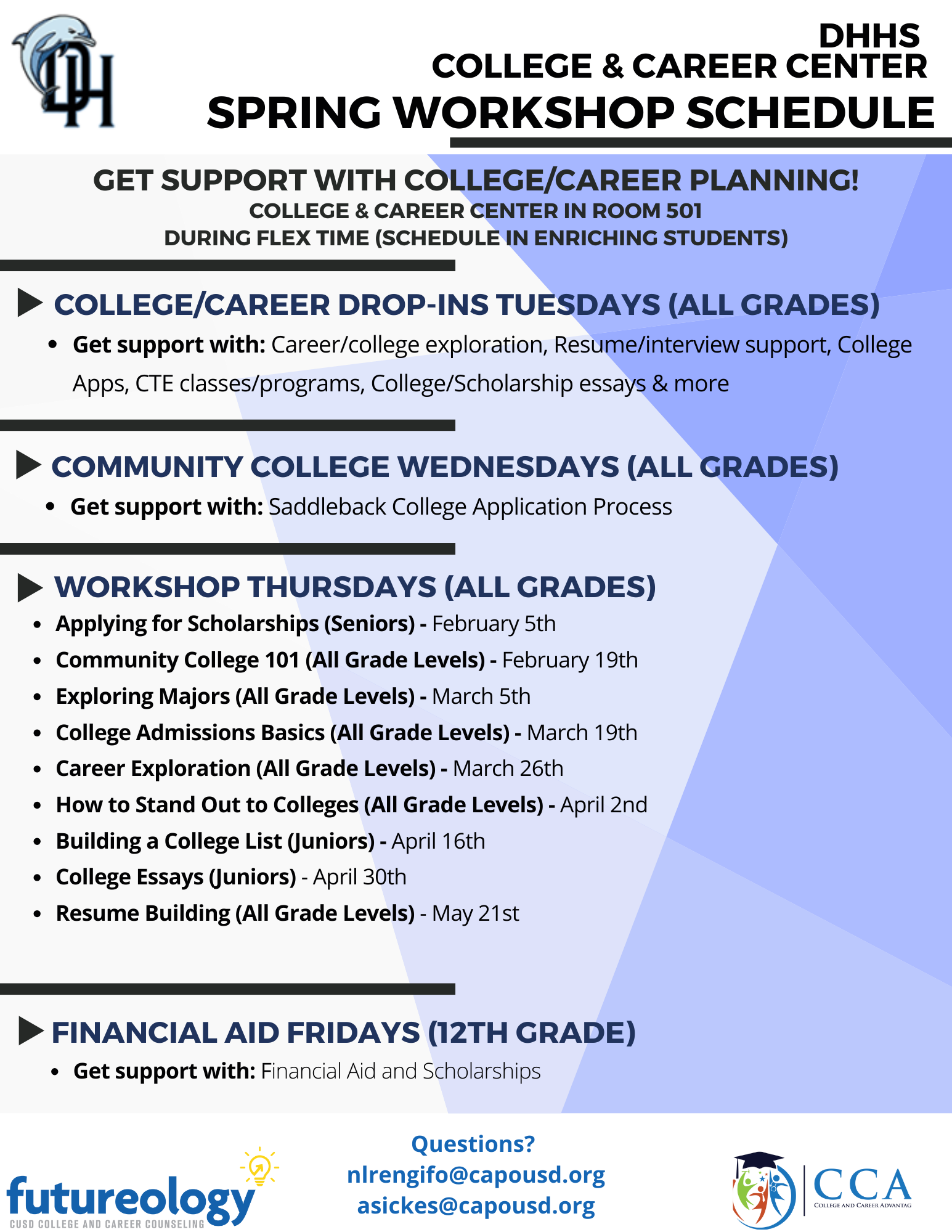 Don't wait! Make an appointment to meet with the DHHS Futureology Counselor, Mrs. Rengifo. Click on the button below. She is available on Monday through Friday, in Room 501.